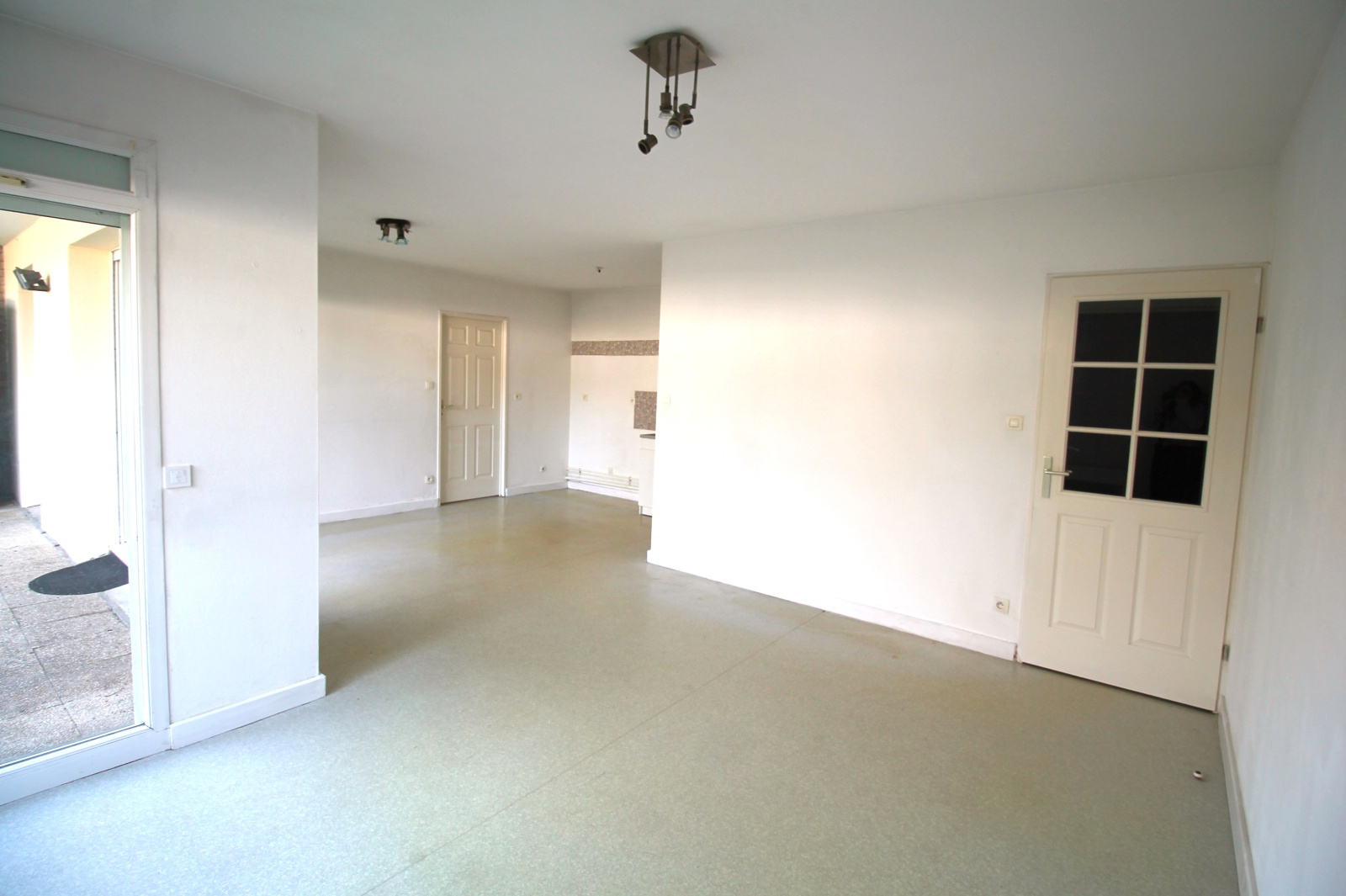 Un hall d'entrée, une pièce de vie avec baie vitrée, une cuisine ouverte avec également sa baie vitrée, une chambre avec porte fenêtre, une salle de bain et un wc séparé.