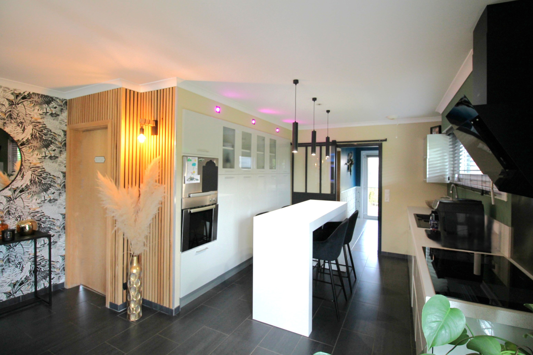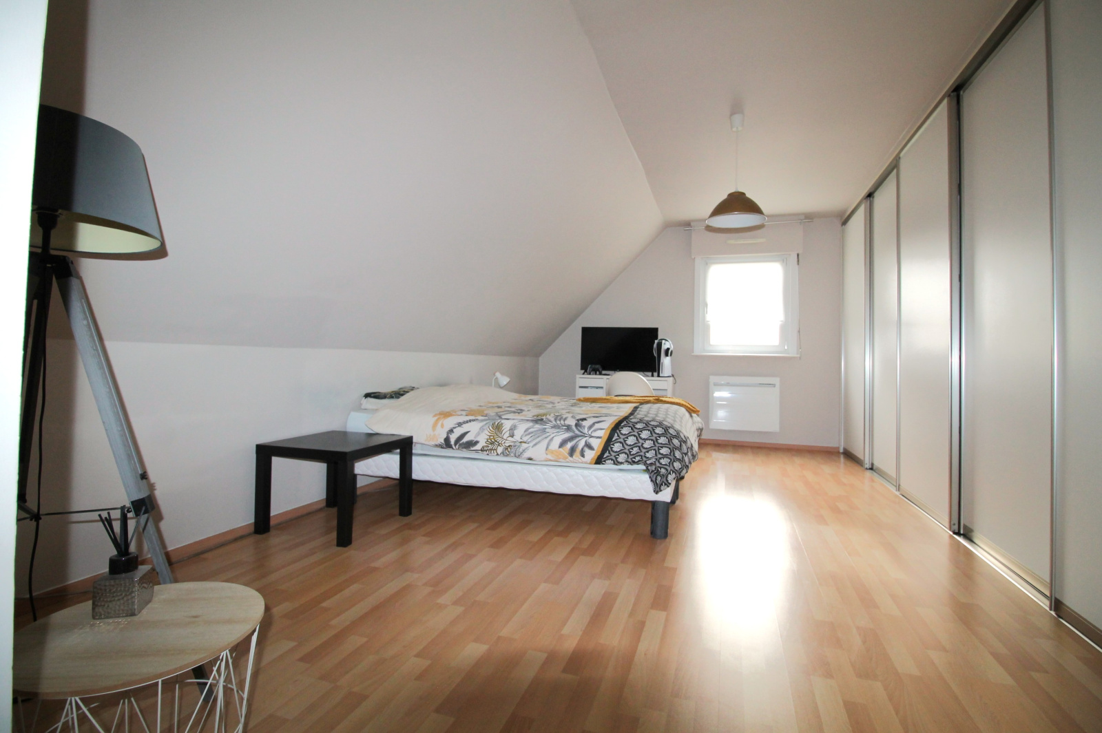 Au rez-de-chaussée, vous profiterez d'un hall d'entrée, d’une pièce de vie lumineuse et moderne de 57 m² avec sa cuisine ouverte équipée meublée alliant confort et convivialité, d'une grande chambre, et d'un cellier.